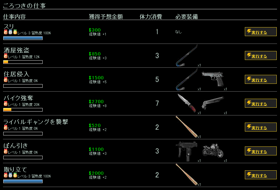 仕事はみんなLv3の100%でMAXっぽい。とりあえずスリと取り立てまで完了。